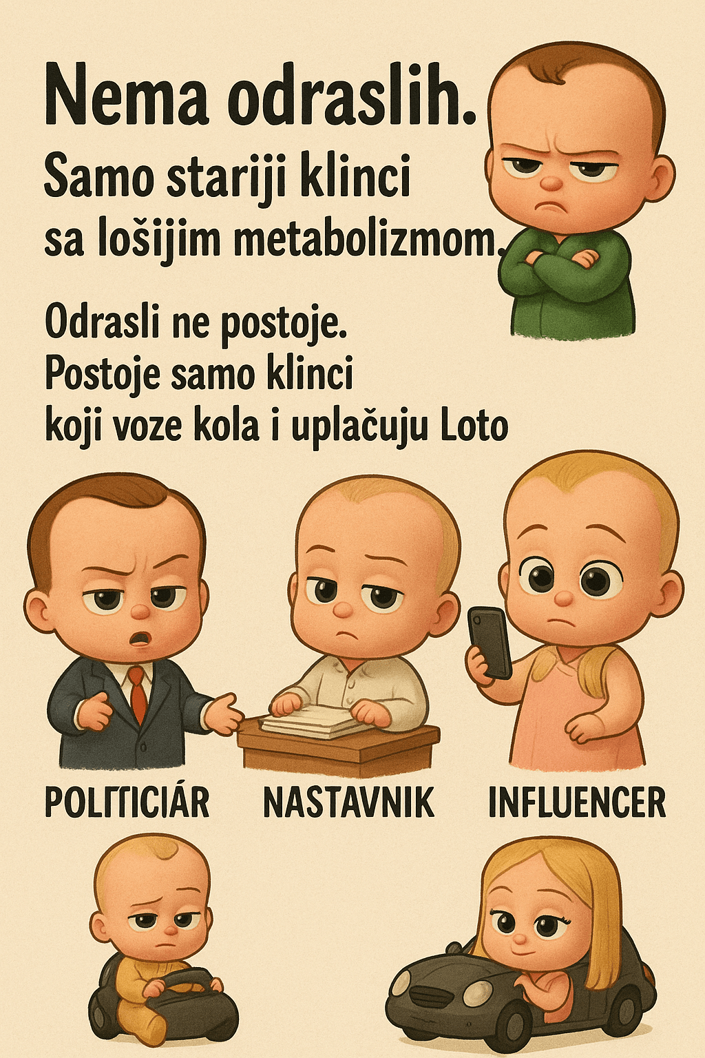 Političari su posebna sorta “odraslih” — to su ljudi koji glume ozbiljnost, a nose kravate kao deca koja su se obukla za maskenbal na temu crtanog filma “Mali šef”. I svaki dan na TV-u gledamo iste likove kako se deru, prete, izmišljaju zaveru protiv Srbije jer je neko rekao da su zgrade na Novom Beogradu ružne.